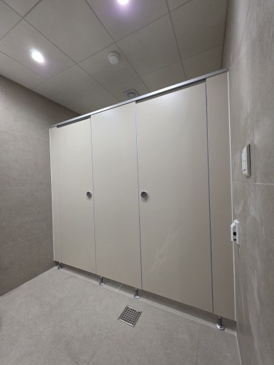 제품사양 판재 20T방수PB(파티클보드)+HPM 색상 대신메라민 1212DE(회색) 높이 도어 H1800(일반높이)포스트 및 간벽코너 H2300(천정X) 특이사항 1층 입구 레미탈 양생중 시공물량 본관 1층, 2층 5칸 / 소변기칸막이 1개 시공 전 시공 후